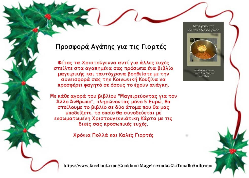 Η ομάδα των food bloggers σας δίνει τη δυνατότητα να στείλετε αυτό το υπέροχο δώρο με τις προσωπικές σας ευχές και υπογραφή σε δύο αγαπημένα σας πρόσωπα και ταυτόχονα να βοηθήσετε την Κοινωνική Κουζίνα να προσφέρει δωρεάν φαγητό σε όσους το έχουν ανάγκη.